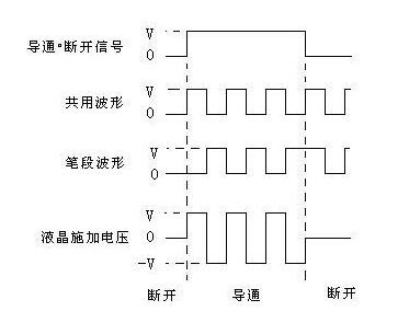 靜態(tài)驅(qū)動,在相對應(yīng)的一對電極間連續(xù)外加電場或不外加電場。根據(jù)此電信號,筆段波形不是與公用波形同相就是反相。同相時(shí)液晶上無電場,LCD處于非選通狀態(tài)。